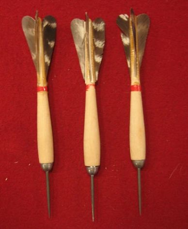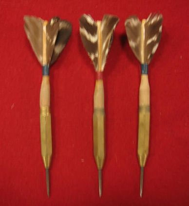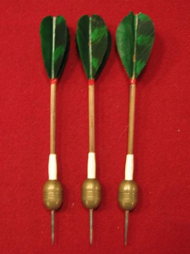 I really liked these hexagon shaped darts they are a good example of early brass darts. Real feathered flights too.